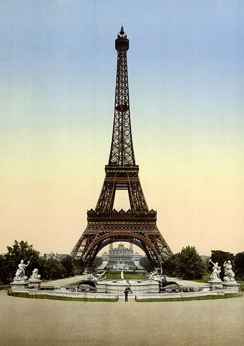 Vintage photochrom print of the Eiffel Tower at the 1900 Exposition Universelle in Paris, viewed across the Champ‑de‑Mars toward the Trocadéro.