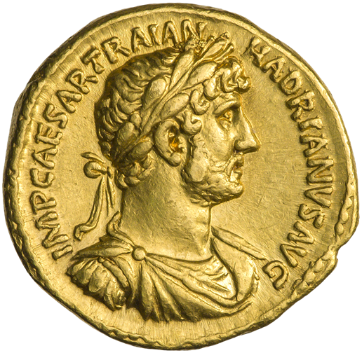 Gold Roman aureus showing Emperor Hadrian’s bust (circa 119–122 AD), obverse of ancient coin from the Roman Empire.