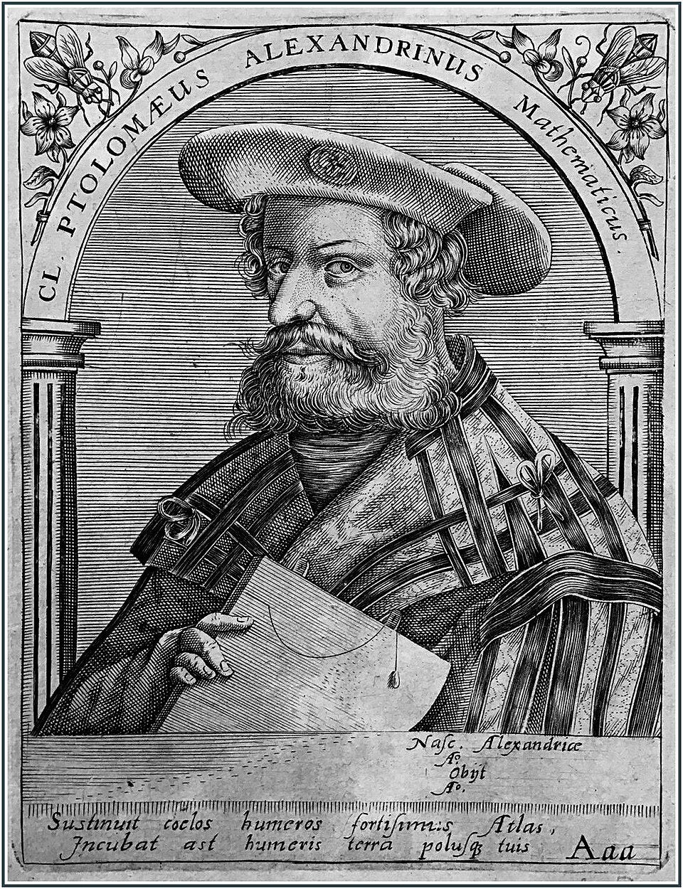 16th-century engraved portrait of Claudius Ptolemy, the Greco-Roman astronomer and geographer, shown in Renaissance scholarly style.