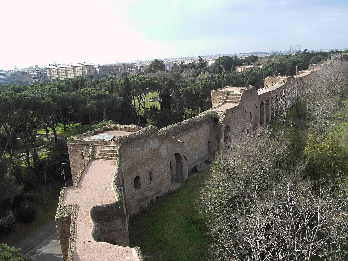 The Aurelian Walls were a massive defensive circuit around Rome built during Third Century Crisis and barbarian threats. Stretching 12 miles, 26 feet high (later raised), and 11.5 feet thick, with 380 towers and 18 gates, they incorporated existing structures like aqueducts for rapid construction. Symbolizing renewed imperial strength, they protected Rome for centuries—halting an Arab raid in 846—and defined the city's boundaries until the 19th century. Among the best-preserved ancient walls, they showcase Roman engineering efficiency and marked a shift to fortified urban defense.