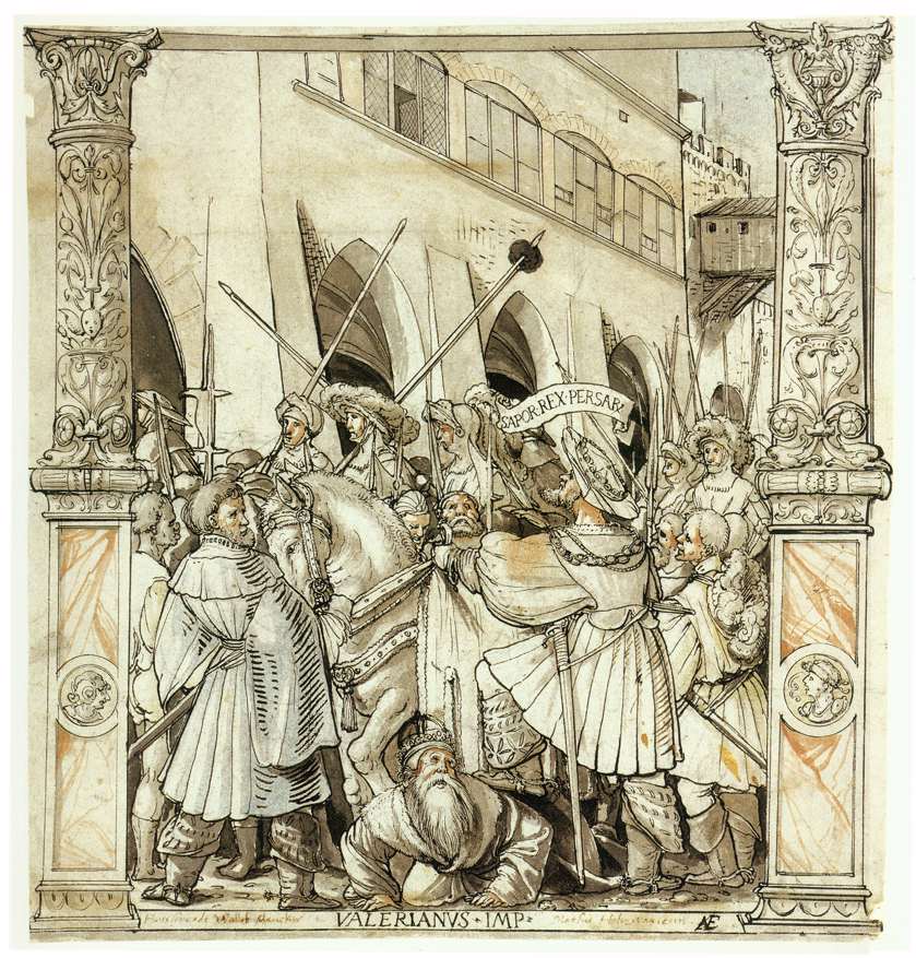 Hans Holbein the Younger’s drawing The Humiliation of the Emperor Valerian by the Persian King Shapur, c.1521, showing Roman emperor’s defeat.